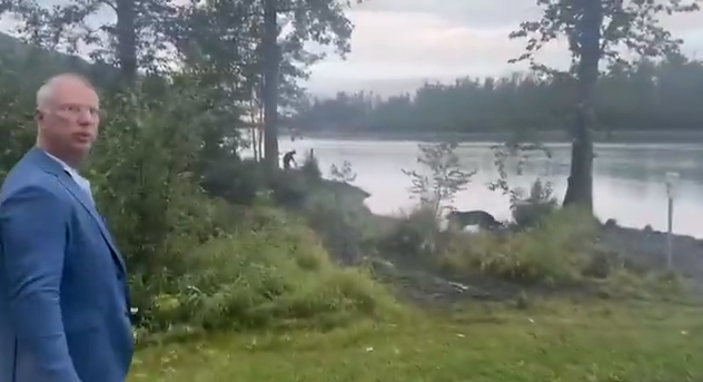 На видео видно, что Дмитриев находится в окрестностях Анкориджа или в парковой зоне у реки, на небольшом расстоянии от него можно заметить медведя. Дмитриев двинулся ему на встречу.