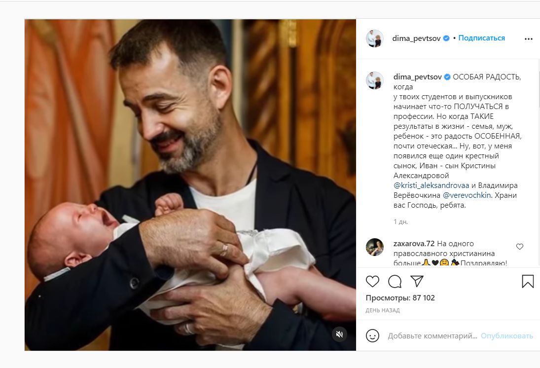 Впрочем, подписчики сразу поняли, что речь не о пополнении в семье Певцова - просто артист стал крёстным отцом. Малыш на фотографии - это сын выпускников Дмитрия, молодых актёров Кристины Александровой и Владимира Верёвочкина. Мальчик родился около месяца назад.