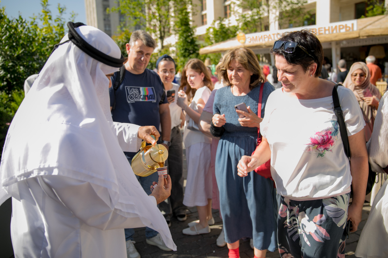 Посетители на Манежной площади также смогут посмотреть на национальные танцы жителей эмиратов, познакомиться с народными ремёслами тех краёв, насладиться ароматами восточных благовоний и парфюма. Помимо этого, гости смогут отведать блюда национальной кухни ОАЭ, приобрести приглянувшийся сувенир.