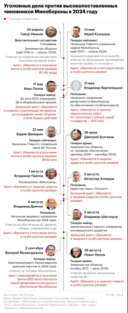 РБК насчитал, что сегодня возбуждено как минимум 12 уголовных дел против высокопоставленных чиновников Минобороны. И, очевидно, это список не окончательный. Скоро в нём будут новые имена.