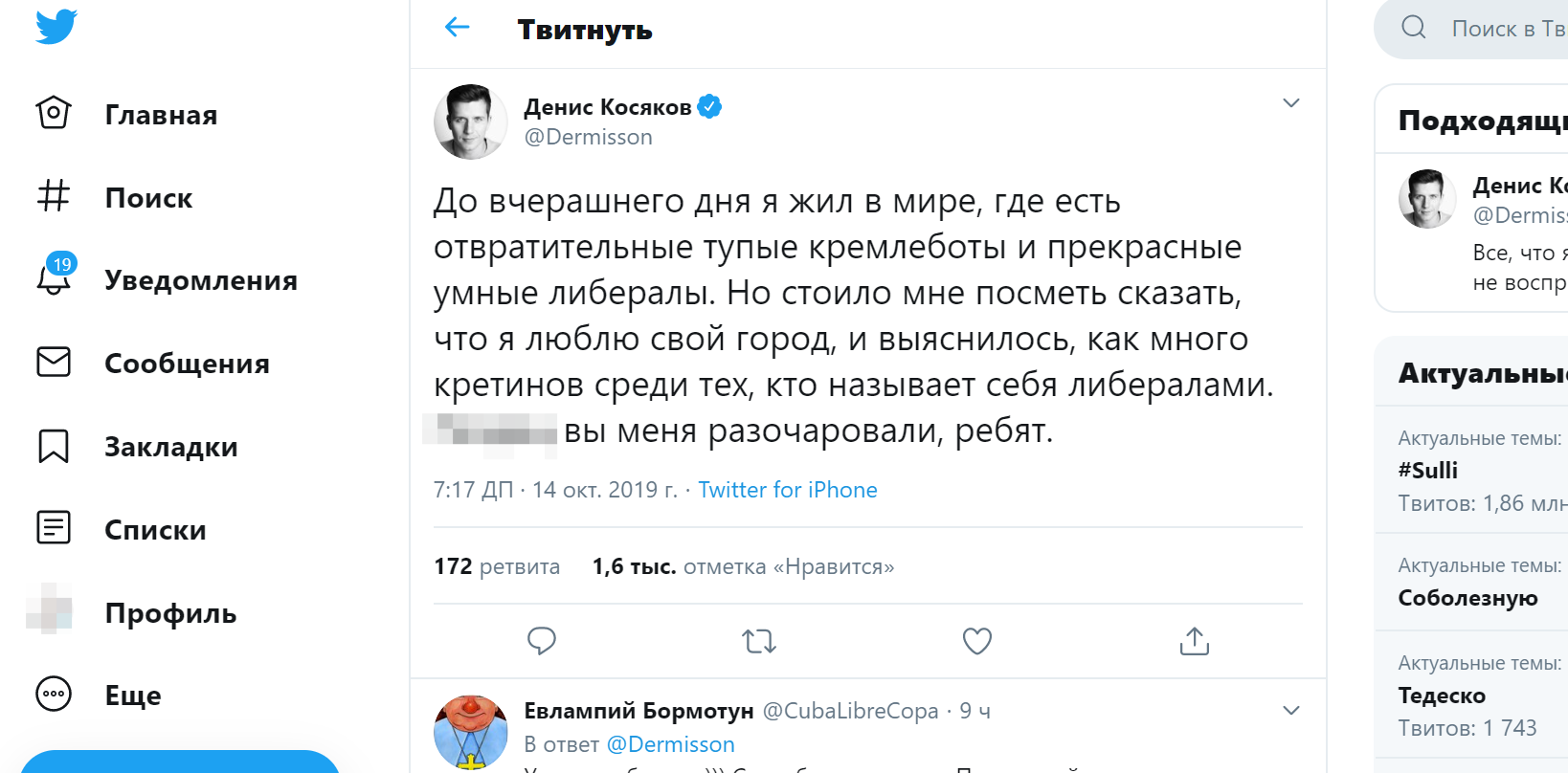 "До вчерашнего дня я жил в мире, где есть отвратительные тупые кремлеботы и прекрасные умные либералы. Но стоило мне посметь сказать, что я люблю свой город, и выяснилось, как много кретинов среди тех, кто называет себя либералами. Вы меня разочаровали, ребят", - написал он.
