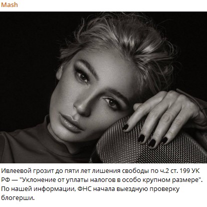 По данным Mash, Ивлеевой грозит до пяти лет лишения свободы по ч. 2 ст. 199 УК России "Уклонение от уплаты налогов в особо крупном размере". Уточняется, что ФНС начала выездную проверку блогерши.