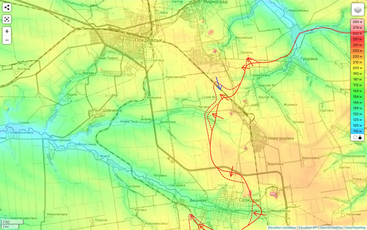 На Покровском направлении бои у Николаевки в сторону Мирнограда. Южнее Селидово идут накаты с целью окружения города. По данным бывшего депутата Верховной рады Олега Царёва, боестолкновения идут западнее Николаевки и в районе Сухого Яра и Лысовки.