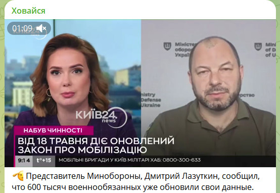 Эта цифра, 600 тысяч, вероятно, набралась не только с 18 мая, когда вступил в силу закон об ужесточении мобилизации, а с момента его подписания президентом Зеленским 16 апреля, предполагает украинский ТГ-канал "Ховайся". Название ресурса переводится как "прячься". ТГ-канал призван помогать народу, когда власть начинает действовать по беспределу. Сегодня офис президента Украины устроил из мобилизации могилизацию. С задачей утилизировать как можно больше украинцев.