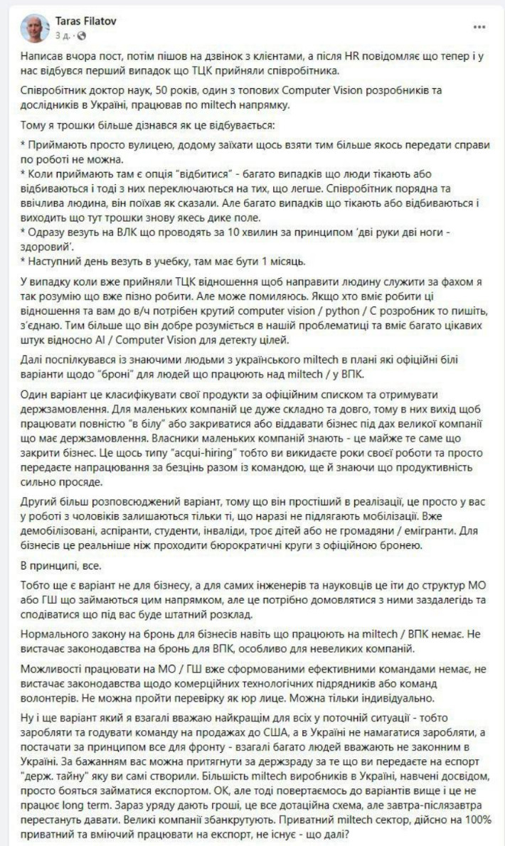 Украинский IT-бизнесмен Тарас Филатов рассказал, как военкоматы мобилизуют квалифицированных айтишников, включая случай, когда сотрудника IT-фирмы, доктора наук, забрали прямо с улицы.