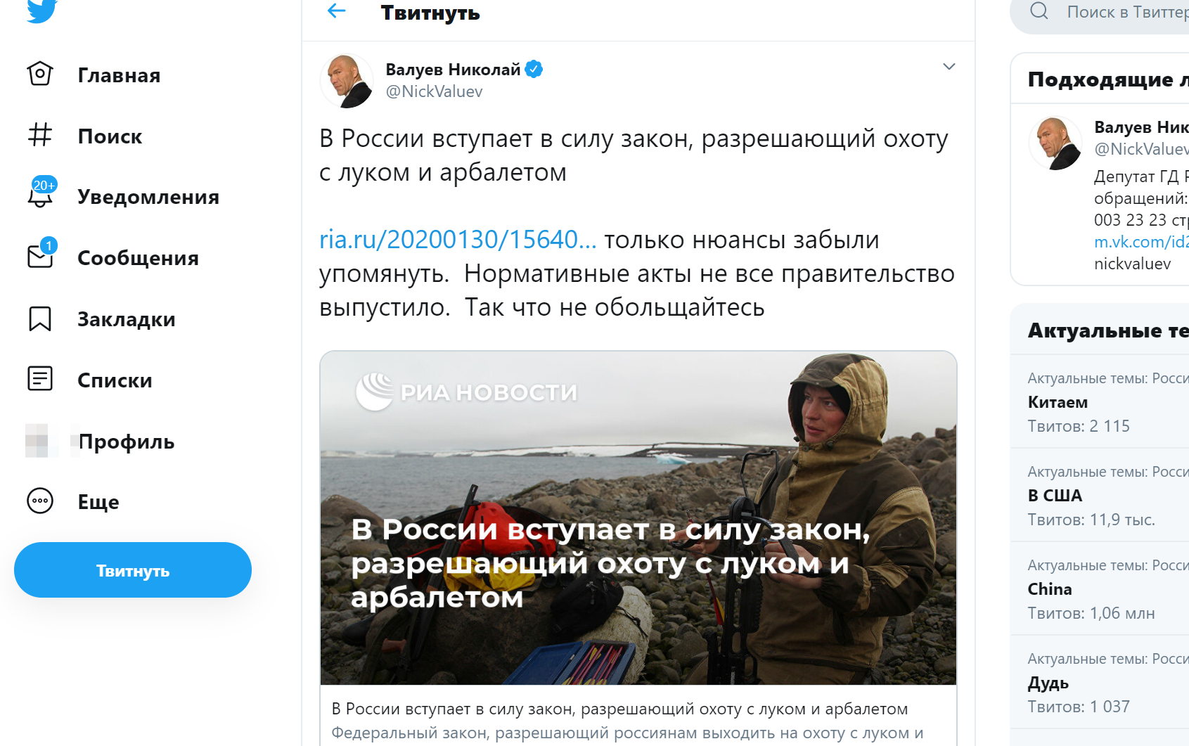 "Добро" на лук и арбалет? Валуев посоветовал охотникам не обольщаться
