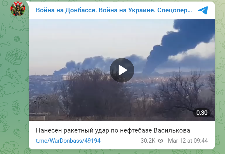 10:00 Нанесён ракетный удар по нефтебазе Василькова - СМИ.