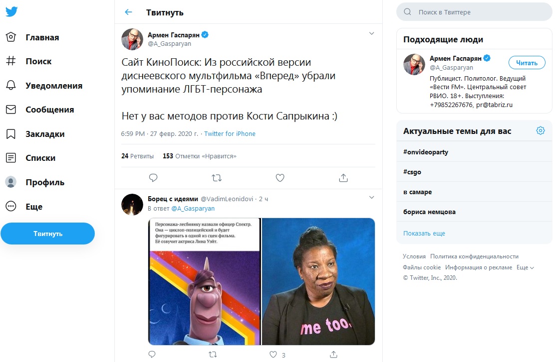 Из российской версии мультфильма "Вперёд" убрали циклопа нетрадиционной сексуальной ориентации. Либералы негодуют, соцсети смеются. "Доколе режим будет лютовать???" - иронизируют пользователи.