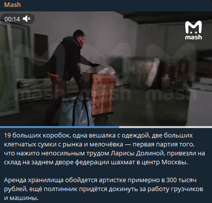 Впрочем, возможно, до этого не дойдёт: телеграм-канал Mash выяснил, что Долина арендовала за 300 тысяч помещение в 160 кв метров у федерации шахмат России, именно туда начали накануне перевозить вещи артистки.