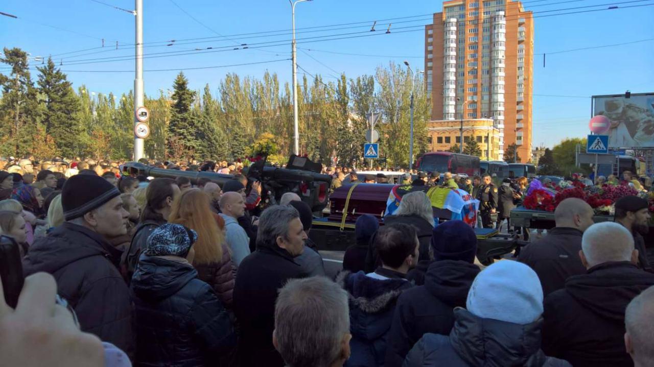 Гроб с телом Павлова установили на пушечный лафет. Затем под аплодисменты людей тягач поехал по центральной улице Донецка. Сразу за тягачом следуют глава ДНР Александр Захарченко вместе с другими представителями руководства ДНР и официальными лицами.