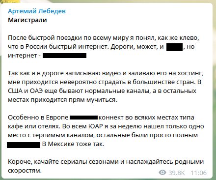 "После быстрой поездки по всему миру я понял, как же клёво, что в России быстрый интернет, - так восхитился отечественным коннектом в авторском Telegram-канале известный российский блогер Артемий Лебедев. Правда, радость он выразил вслед за этим в том числе и матерными словами: - Дороги, может, и… (нецензурно), но интернет - … (нецензурно)".