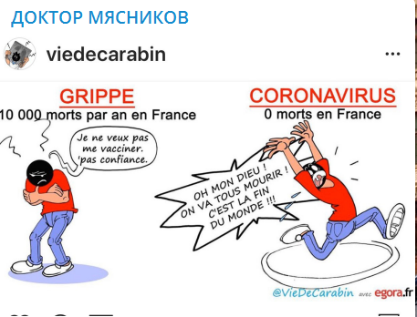 Слева на карикатуре изображён человек, говорящий: "Ой, никаких вакцин, не верю!!!", а над ним надпись: "ГРИПП с его 10 000 доказанных смертей в год во Франции". Справа тот же самый человек кричит: "Мы все умрём! Конец света!" Но на этот раз над ним надпись: "КОРОНАВИРУС с нулевой смертностью во Франции".