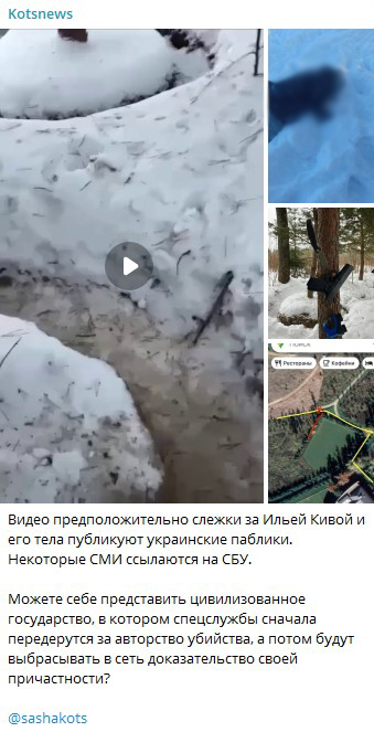 Сначала посты с кадрами появились в украинских Telegram-каналах, а позже дошли до новостных сайтов и даже со ссылкой на СБУ. На видео показан, как утверждается, пункт наблюдения за передвижениями политика, который часто записывал ролики в этой местности. А на фото - якобы тело Кивы сразу после убийства. Сообщается, что операция СБУ по ликвидации бывшего нардепа готовилась долгое время.