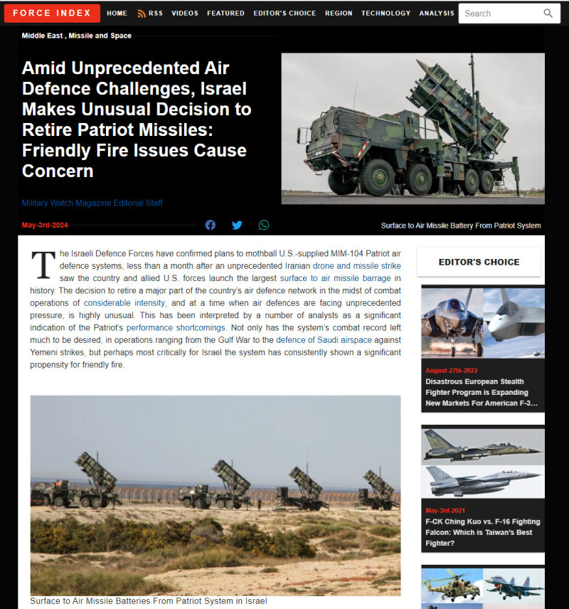 Подтверждение планов по выводу Patriot на пенсию произошло на фоне появления большого количества сообщений о проблемах с огнём по своим во время операций израильских ВВС и ПВО, в ходе которых сбито значительное количество дружественных беспилотников. Американские военные источники сообщают, что 40% летательных аппаратов, сбитых израильскими войсками в последние месяцы, были дружественными", - пишет MWM.
