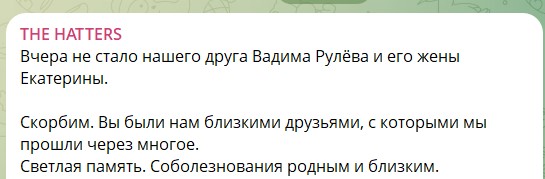 "Вчера не стало нашего друга Вадима Рулева и его жены Екатерины. Скорбим. Вы были нам близкими друзьями, с которым мы прошли через многое. Светлая память. Соболезнования родным и близким", - сообщил музыкальный коллектив в Telegram-канале.