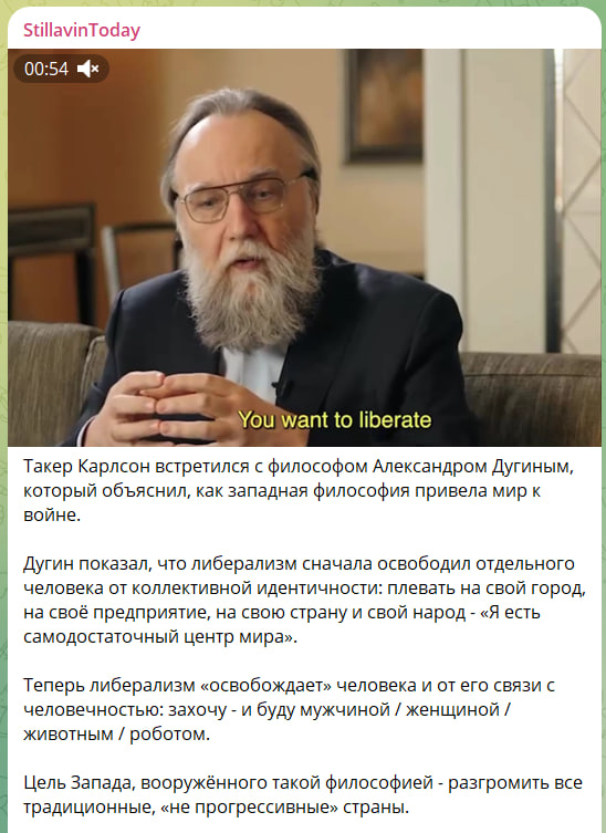 И вот таким образом либерализм как основа западной философии, всё это "освобождение" человека от человечности - всё это стало обслуживающим инструментом западных "элит", вырвавших "человека из общины" и поставивших "к станку беззащитного угнетаемого раба", что постепенно привело мир к войне, поскольку такая концепция оказалась условно жизнеспособна лишь в противостоянии с теми странами, которые стоят на страже традиционных ценностей. И вся эта попытка "отменить" нашу страну, говорил Дугин в беседе с Карлсоном, походит на провокацию и призывы к военной эскалации.