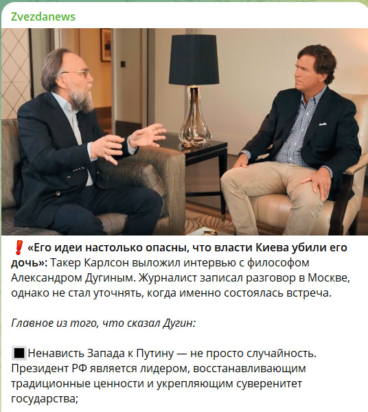Ранее учредитель Царьграда Константин Малофеев подчеркнул, что "интервью Александра Гельевича Дугина Такеру Карлсону - событие мирового масштаба. Великий русский философ беседует с великим американским журналистом".