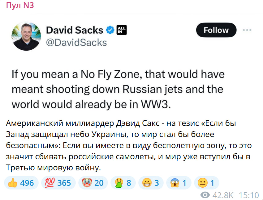 С такой позицией категорически не согласился другой бизнесмен. Американский миллиардер Дэвид Сакс поспорил с этим тезисом Экмана, указав, что вмешательство Запада привело бы к большой беде.