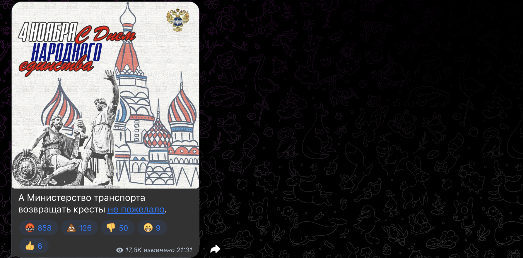 А вот Минтранс не сразу отреагировал на замечание и ещё некоторое время в официальном канале министерства красовалось изображение храма без крестов. Вскоре картинку поменяли на более "примитивную".