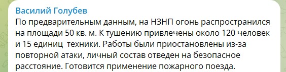 "Работы были приостановлены из-за повторной атаки, личный состав отведен на безопасное расстояние. Готовится применение пожарного поезда", - рассказал Голубев.