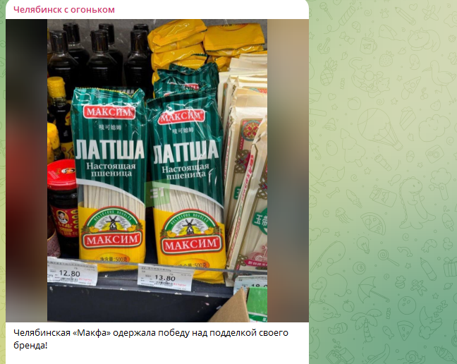 Китайские производители вышли на рынок с упаковкой лапши, очень похожей на челябинскую "Макфу". В тех же почти цветах, но с другим названием. Двойник "Макфы" носит имя "Максим" и предлагает покупателям не лапшу, а латтшу. При желании можно поискать пять отличий.
