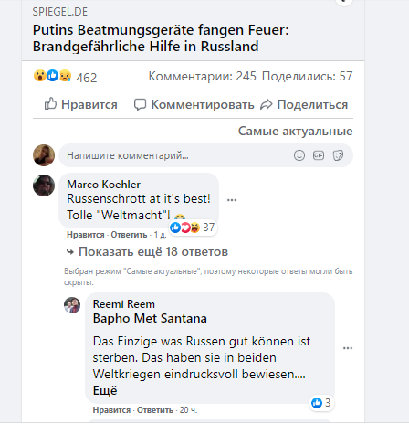 Трагедии, когда при пожаре из-за неисправных аппаратов ИВЛ в Петербурге и Москве погибли пациенты, мало кого оставили равнодушным. Но нашлись и те, кто увидел в гибели людей повод для злорадства: немецкие пользователи Facebook соревнуются между собой в выпадах против "путинских" ИВЛ. А один комментатор без зазрения совести заявил на весь интернет: "Единственное, что русские хорошо умеют, - умирать".
