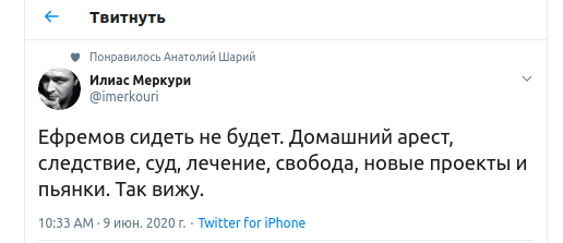 "Ефремов сидеть не будет. Домашний арест, следствие, суд, лечение, свобода, новые проекты и пьянки. Так вижу", - написал журналист.