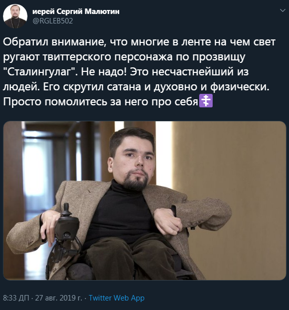 В начале мая текущего года автор скандального Telegram-канала "Сталингулаг" вынужден был деанонимизироваться. Так, выяснилось, что за этим ником скрывается 28-летний инвалид Александр Горбунов. Неожиданно за этого человека заступился иерей Сергий Малютин из Тулы. "Его скрутил сатана", - написал он, призвав просто помолиться за "несчастнейшего из людей".