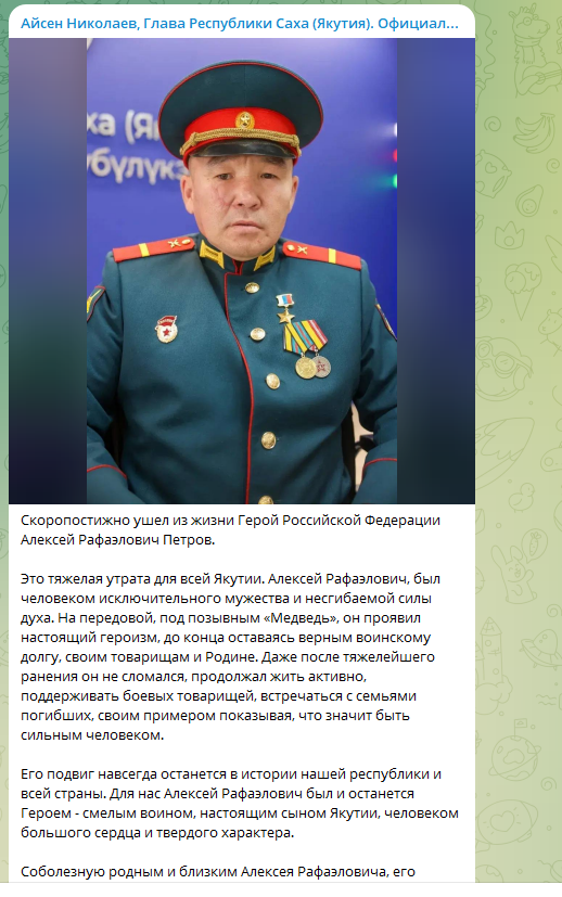 25 апреля стало известно о смерти Алексея Петрова. Герой России – уроженец села Магасс Верхневилюйского улуса Якутии, он гордо называл себя "русским-саха".
