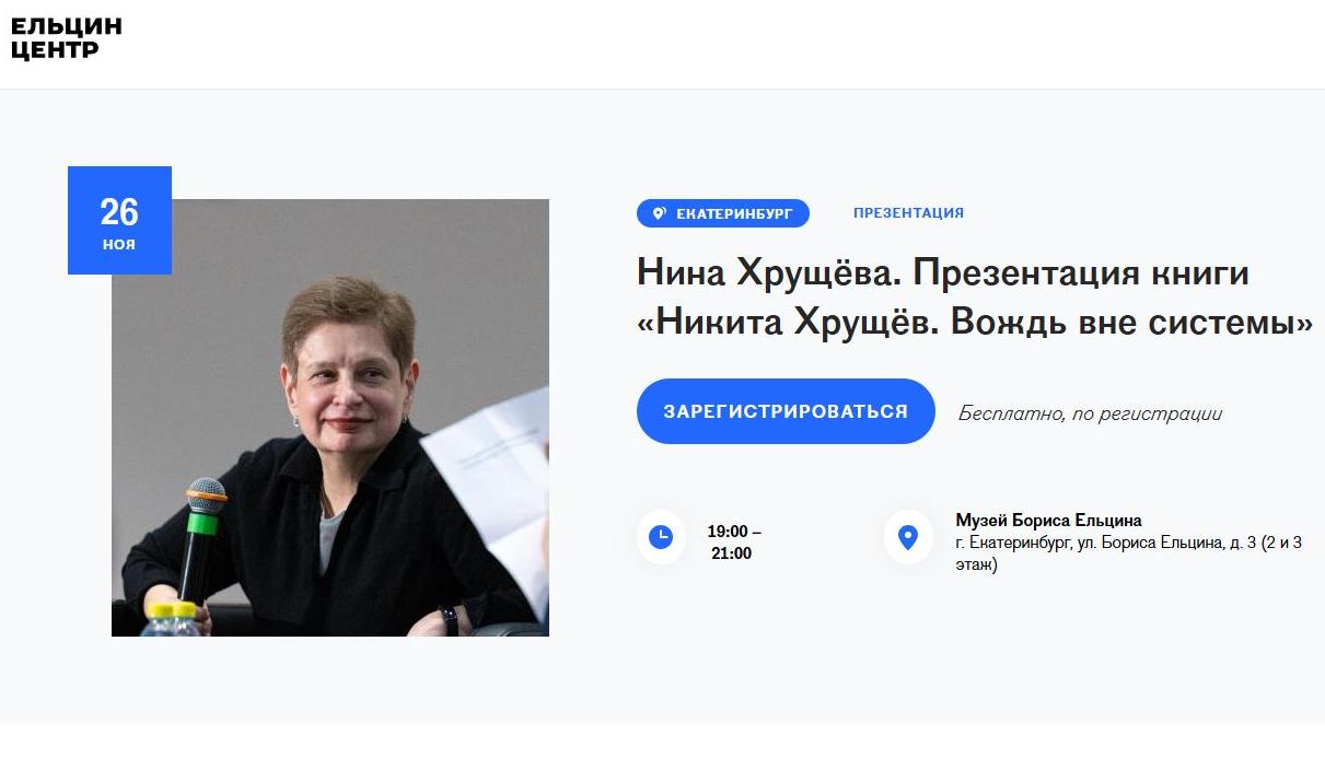 Дополнение: в момент написания текста стало известно, что администрация "Ельцин Центра" отменила выступление Хрущёвой с формулировкой "по техническим причинам"... Так что же, Чубайса всё-таки можно не ждать?..
