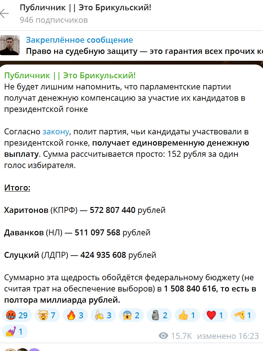 О том, что кандидатам положены выплаты, ранее заявлял Юрист Иван Брикульский в своём телеграм-канале "Публичник".