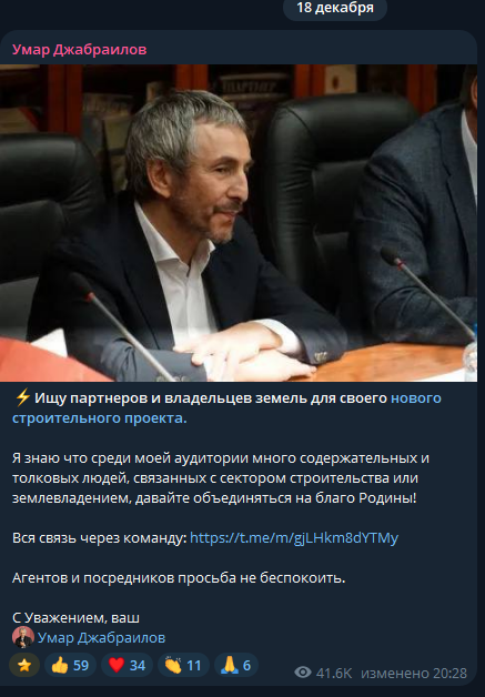 Джабраилов перед смертью продвигал фантомного застройщика, сообщает издание "Известия". В декабре 2025 года бизнесмен в соцсетях пытался найти заказчиков для строительной компании имени себя.