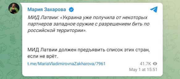 ФОТО: Скриншот https://t.me/MariaVladimirovnaZakharova