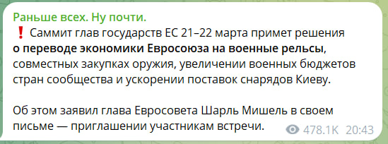 Глава Евросовета Шарль Мишель разослал письма европейским лидерам с приглашением на саммит 21-22 марта с целью договориться о переводе экономики Евросоюза на военные рельсы, рассказывает Telegram-канал "Раньше всех. Ну почти". Согласно заявлениям Мишеля, такая договорённость поспособствует увеличению поставок оружия и снарядов киевскому режиму, которому не так давно европейцы уже одобрили очередной пакет военной помощи.