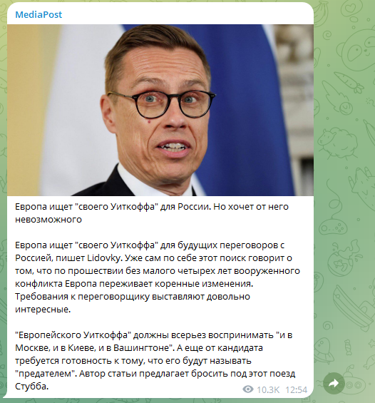 Европа – всё. Сдалась. Брюссель лихорадочно ищет переговорщика, который мог бы стать вторым Стивеном Уиткоффом. Только своего, европейского разлива. Требования к такому дипломату-челноку описала газета Lidovky – судя по всему, ищут кого-то из серии "и швец, и жнец, и на дуде игрец". Назван даже потенциальный кандидат – президент Финляндии.