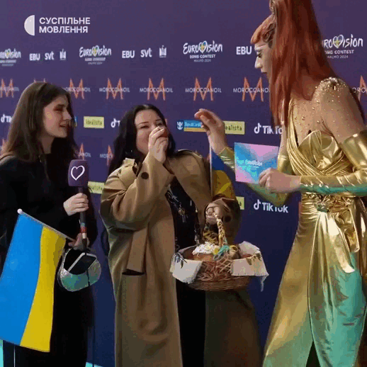 Украину здесь представляет Alyona Alyona. Её фишка - так называемый бодипозитив (это когда следишь за своим физическим состоянием меньше, чем хотелось бы) и рэп. Так вот именно Alyona показала трансгендеру*, встречавшему конкурсантов, как нужно стукаться яйцами на Пасху. Светлая детская забава приобрела неприятный контекст в этом антураже: