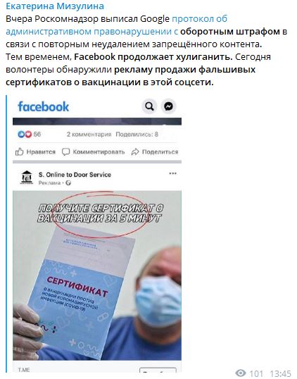 Модераторы Facebook разрешили разместить в русском сегменте социальной сети рекламу фальшивых сертификатов о вакцинации против коронавируса. Распространение подобных документов, спрос на которые у ковид-диссидентов резко увеличился на фоне вводимых во многих регионах ограничений, неизбежно бы вызвал рост заболеваемости в стране. Об этом рассказала член Общественной палаты, глава Лиги безопасного интернета Екатерина Мизулина.
