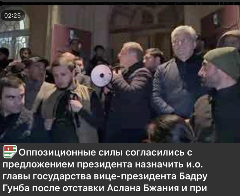 Абхазская оппозиция согласилась с предложением президента Аслана Бжании назначить и.о. главы республики вице-президента Бадру Гунбу, однако при условии, что действующее правительство Абхазии уйдёт в отставку, а руководители силовых структур покинут свои посты. Лидер оппозиции Адгур Ардзинба указал на необходимость назначения нового премьер-министра, который будет устраивать обе стороны, чтобы сбалансировать исполнительную власть перед предстоящими президентскими выборами в марте 2025 года. Ожидается, что Бжания озвучит своё окончательное решение в ближайшее время.