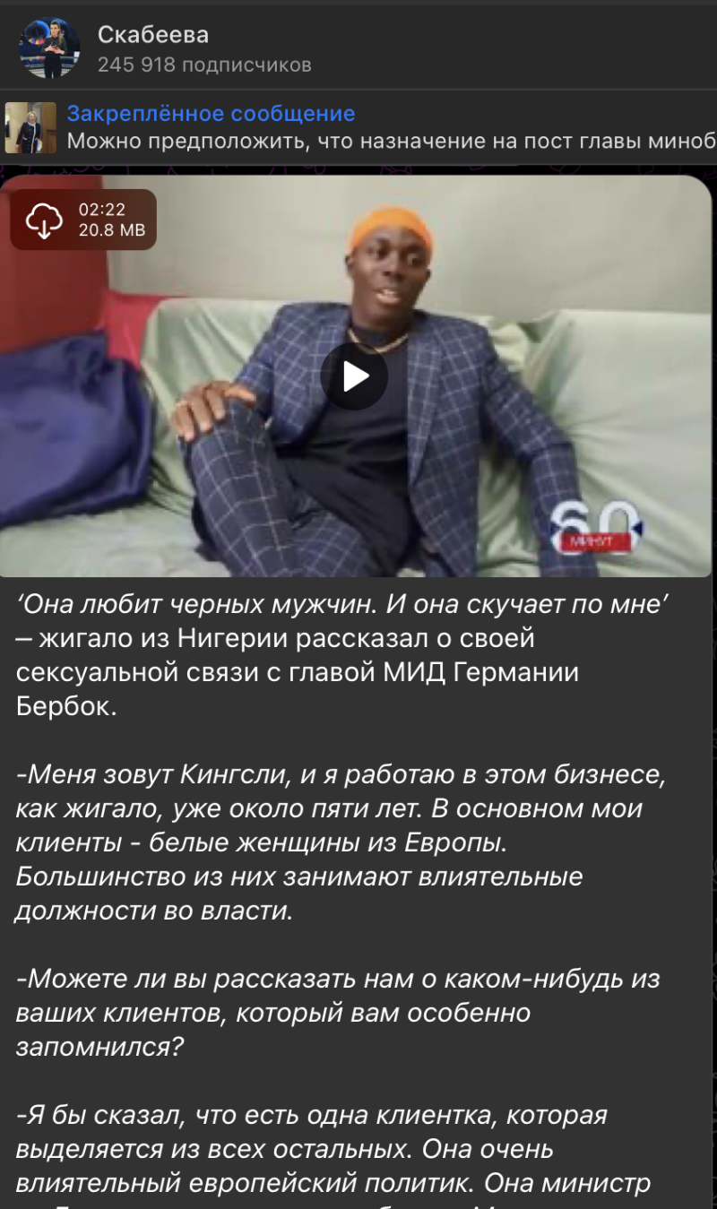 Информация появилась после публикации интервью с мужчиной-жиголо по имени Кингсли, утверждающим, что в 2022 году он оказывал особые услуги высокопоставленному европейскому политику, с которым познакомился в Нигерии. По его словам, "она министр из Германии, если я не ошибаюсь", и они встретились в Абудже. Кингсли вспоминает, что это произошло в декабре 2022 года, когда Бербок участвовала в международной встрече. Он отметил, что она была в красивом малиновом платье.