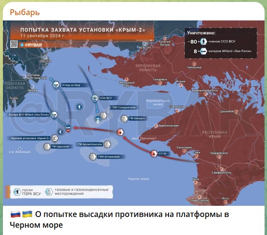 Атака эта, кстати, была сорвана русскими войсками. Из 14 быстроходных катеров с украинским спецназом, вооружённым дронами и переносными зенитными ракетными комплексами, русские военлёты на Су-30 затопили в открытом море восемь. Ещё шесть катеров в ночи успели уйти восвояси к украинскому берегу.