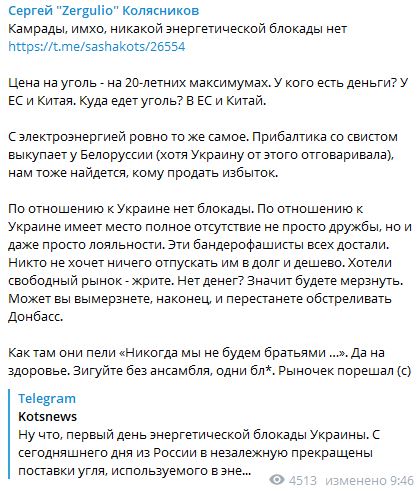"Фашисты достали": Колясников объяснил причину энергокризиса на Украине