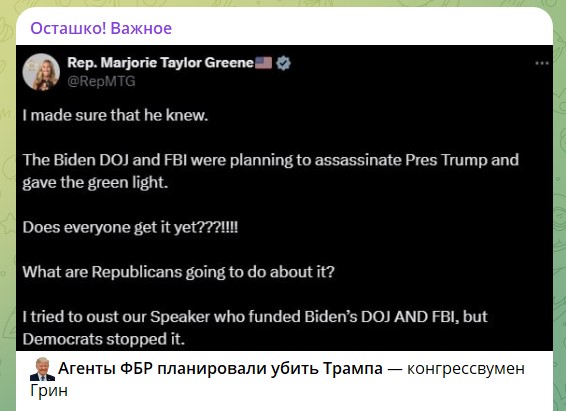 "Министерство юстиции Байдена и ФБР планировали убить президента Трампа и дали на это зелёный свет", - возмущённо пишет в Сети член конгресса США Марджори Тейлор Грин.