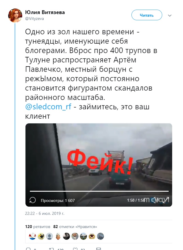 Журналист Юлия Витязева на личной странице в социальной сети Twitter назвала имя автора фейка о 400 трупах в Тулуне, которые тайно вывозят из города. Напомним, ранее о недостоверности информации говорила журналист, член СПЧ Екатерина Винокурова. Витязева добавляет, "одно из зол нашего времени - тунеядцы, именующие себя блогерами".