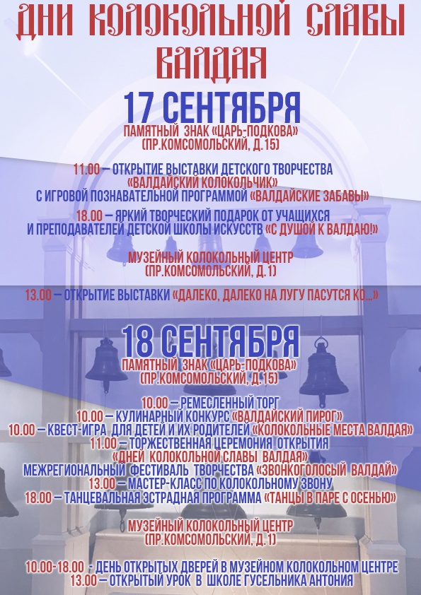 Полная программа мероприятий фестиваля "Дни колокольной славы Валдая" 2022 выглядит так: