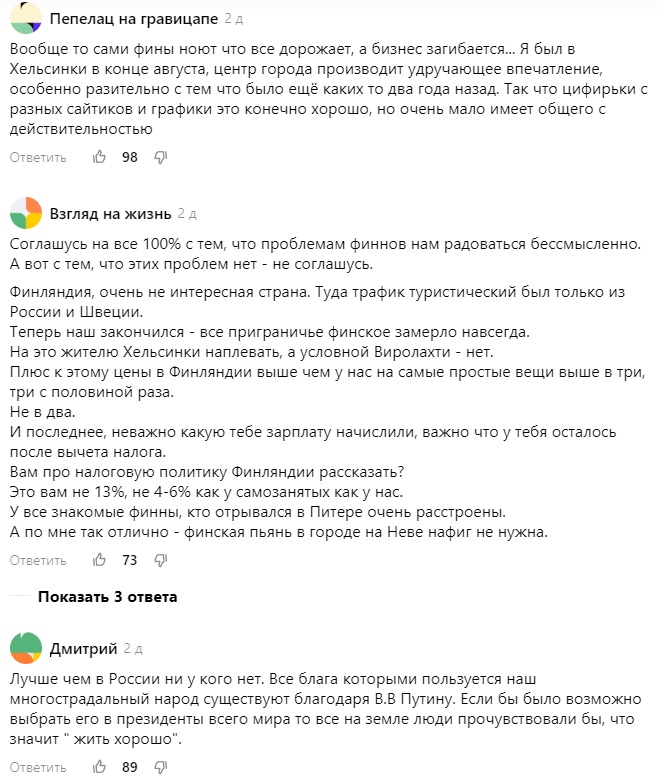 - Красиво написано... но неправда. Не буду обсуждать цифры, скажу как потребитель. У меня ещё есть виза в Суоми, езжу туда, извините, ездил, раз в месяц. Ребёнок учится в университете, ВНЖ имеет и виза выдана на этом основании. Так вот. Полностью разрушенный турсектор. Пустые первые этажи бывших магазинов. В Лапеенранте работает только Изо Кристина. Остальные ТЦ пустуют. То же в Иматре. Центр Хельсинки - съезжают рестораны и магазины. Продукты дороже примерно на 40 % по сравнению с 2021 годом. Все СПА-центры пустуют. Приграничье в полном маргинальном упадке. Строительные фирмы банкротятся. А в целом всё хорошо, прекрасная маркиза. Финны, как и прочая Европа, стремительно идут вперед в либеральное светлое будущее, к деиндустрилизации.