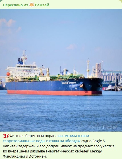 Финская полиция остановила танкер по подозрению в обрыве кабеля, пишет Yle. Судно вытеснили в финские территориальные воды и взяли на абордаж. "Пиратская акция финнов свидетельствует о том, что они окончательно утратили остатки какого-либо уважения к международному морскому праву", - указал "Рамзай".