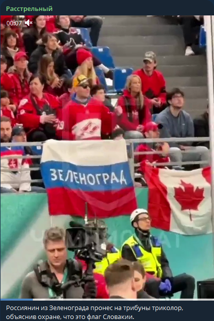 На хоккейном матче Канада-Чехия на Олимпиаде русский болельщик в форме "Спартака" развернул флаг России. Патриот по имени Георгий победил цензуру МОК, сказав на входе охраннику, что это флаг Словении. Функционер поверил, так как на триколоре было написано незнакомое слово - "Зеленоград".