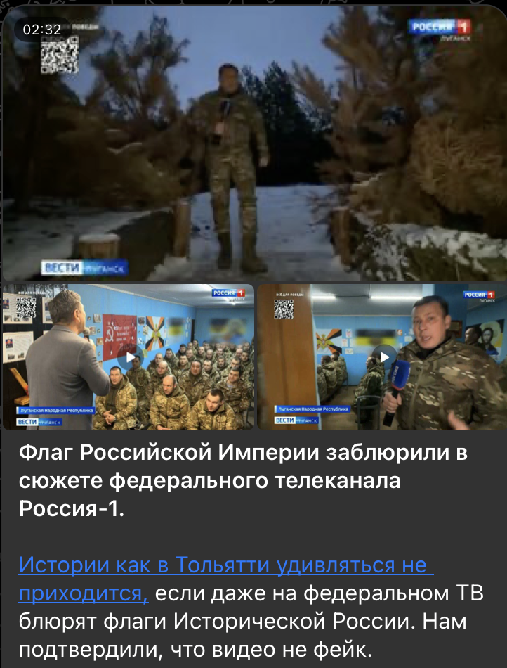 Пришла радостная новость - флаг Российской Империи вернулся в эфиры телеканала "России 1". К слову, появился не только флаг Российской Империи, но и стяг Спаса Нерукотворного. Ранее их позорно замазали в одном из выпусков новостей. Данный инцидент вызвал негативную реакцию со стороны народа и бойцов, которые выразили недовольство, что эти знаки, представляющие их историю и идентичность, подверглись неоправданной цензуре.