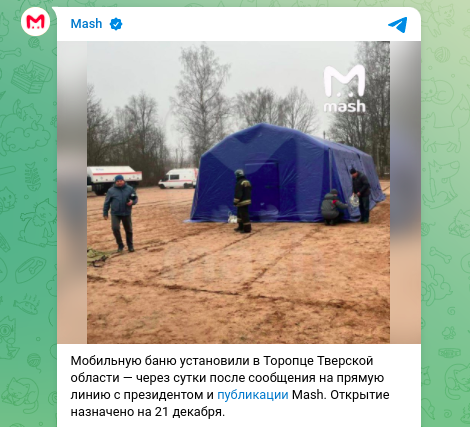 Ситуация изменилась лишь тогда, когда отчаявшиеся люди направили свой вопрос на прямую линию с президентом Владимиром Путиным, а журналисты Telegram-канала Mash его зафиксировали. Сразу после этого власти внезапно обнаружили возможности. Уже через сутки после публикации в город привезли и установили мобильный банный комплекс.