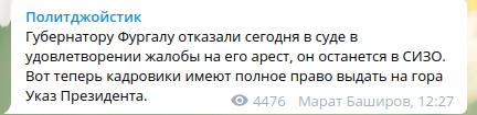 "Губернатору Фургалу отказали сегодня в суде в удовлетворении жалобы на его арест, он останется в СИЗО. Вот теперь кадровики имеют полное право выдать на-гора указ президента", - пишет политический эксперт.